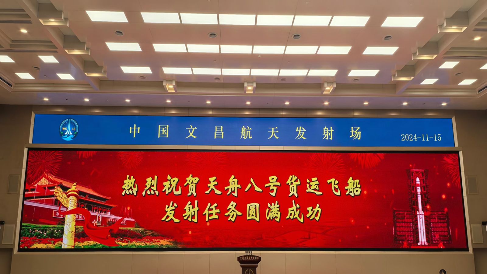 2024年11月15日,搭载天舟八号货运飞船的长征七号遥九运载火箭,在我国文昌航天发射场点火发射,约3小时后,天舟八号货运飞船与空间站组合体完成交会对接,顺利完成2024年中国载人航天任务收官任务。天舟八号货运飞船装载了航天员在轨驻留消耗品、推进剂、应用实(试)验装置等物资,并为神舟十九号航天员乘组送去蛇年春节的“年货”。这次任务是我国载人航天工程进入空间站应用与发展阶段后的第3次货运补给任务。