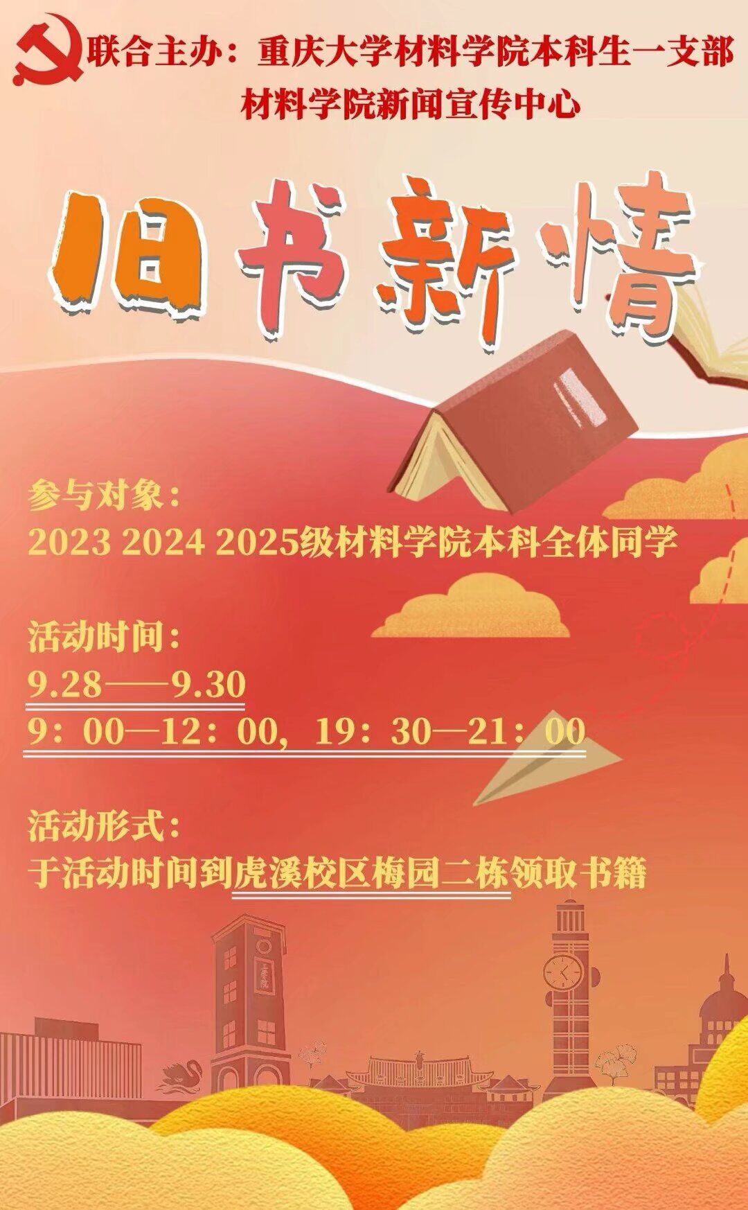 9月28日至30日,重庆大学材料科学与工程学院本科生一支部联合学院新闻宣传中心,于B区材料楼102储藏室和科学城校区梅园二栋一楼活动室,成功举办“旧书新情”书籍传承活动。此次活动面向学院2023、2024、2025级全体本科同学,旨在促进学院学风建设,搭建跨年级交流桥梁,营造互助共享的学习氛围。