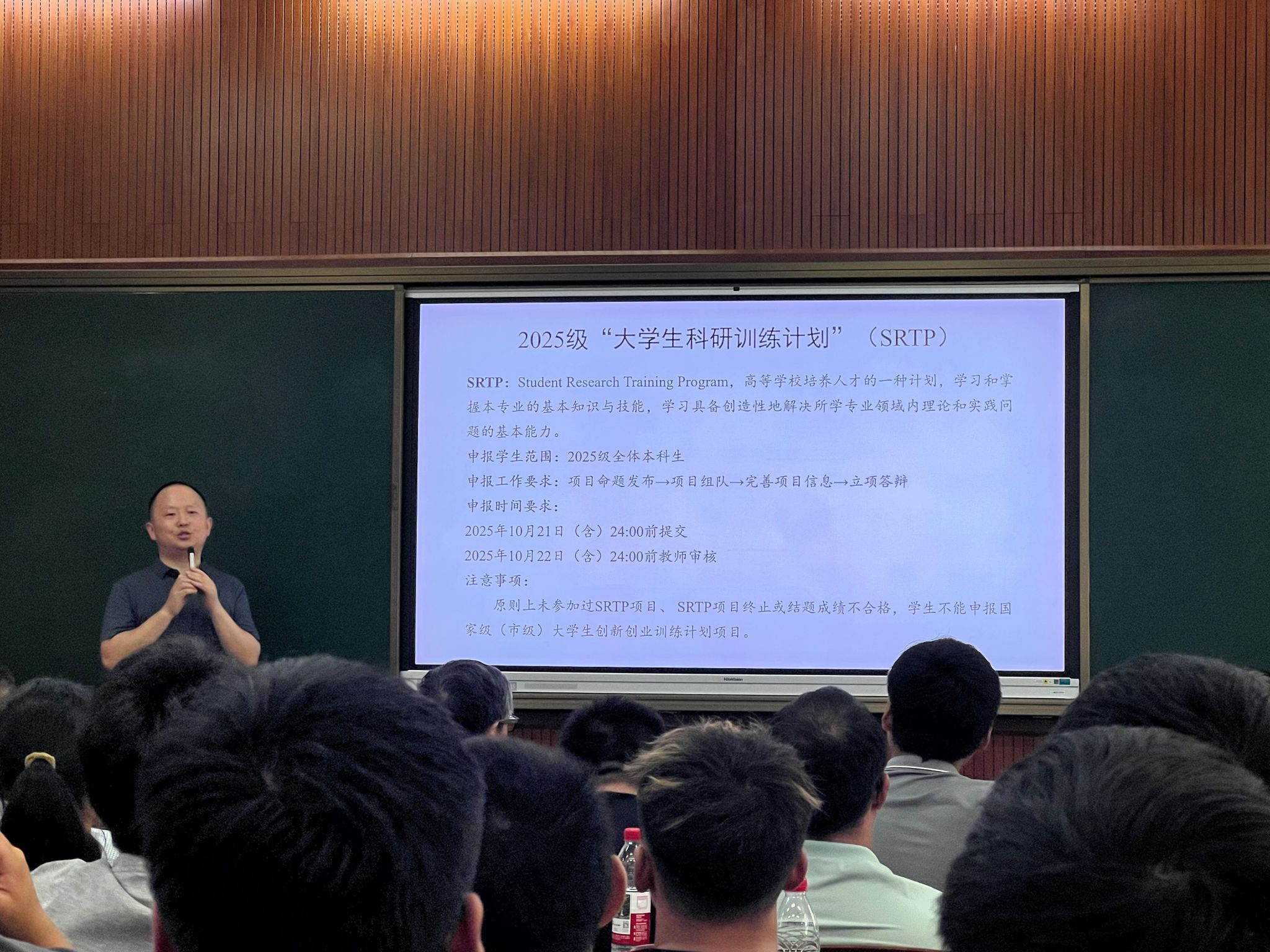 为引导新生尽早接触科研、培养创新能力,会议特地安排了“SRTP(大学生科研训练计划)动员”。王宏坡向新生们详细解读了SRTP的政策、申报流程、历年优秀项目案例以及参与科研训练对个人能力提升的重要意义。鼓励同学们勇于尝试,积极组建团队,主动联系导师,在科研实践中巩固理论知识,锻炼解决复杂工程问题的能力,为未来的学术深造或职业发展奠定坚实基础。