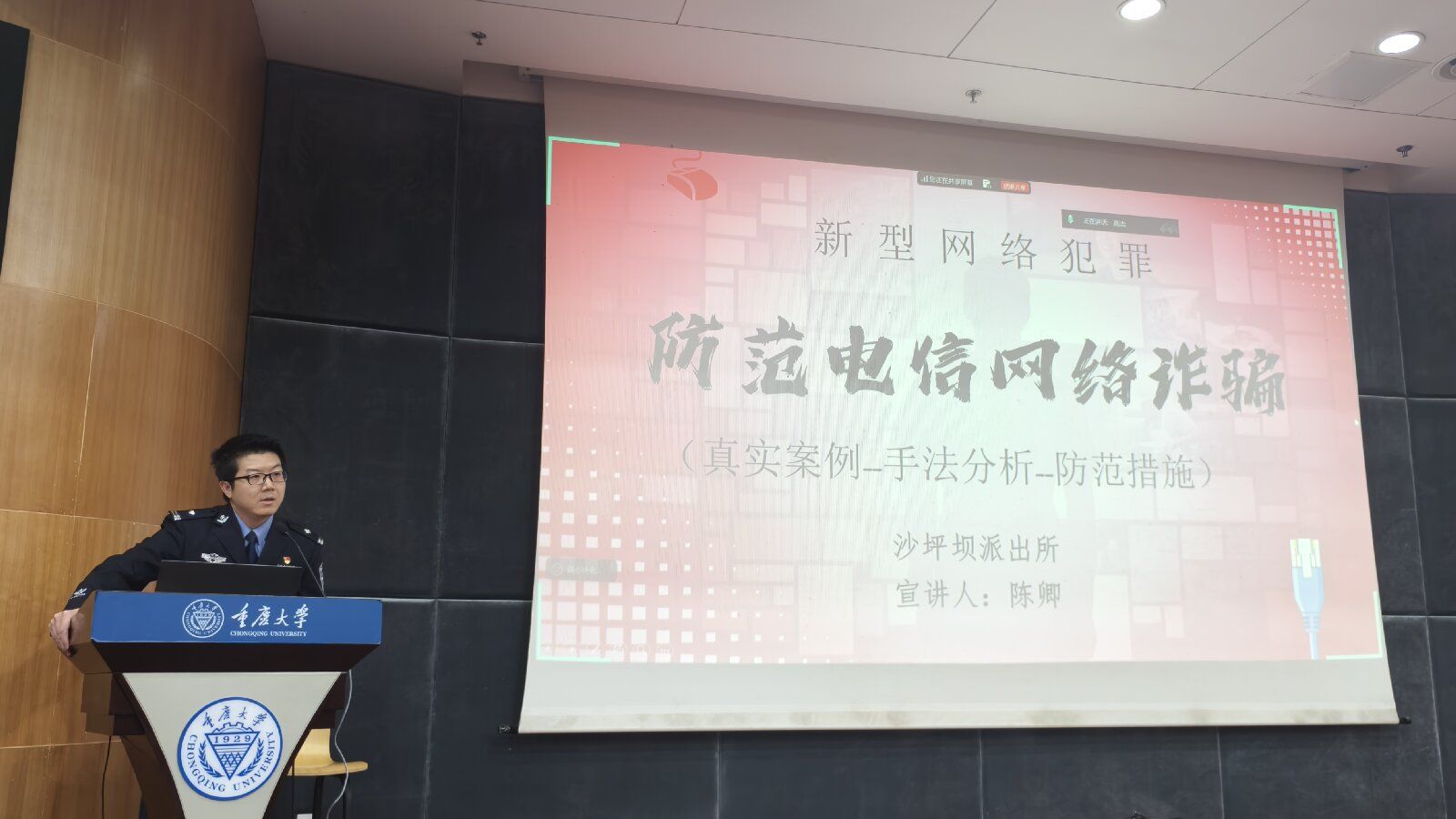 2025年11月7日,为切实提升师生安全防范意识与心理健康素养,材料学院组织开展2024级研究生年级教育大会,涵盖防范电信网络诈骗与心理健康两大核心主题。通过理论讲解、案例分析、互动交流等多元形式,为参会师生呈现了一堂实用且深刻的教育课程。主讲嘉宾邀请到沙坪坝派出所副所长陈卿和心理中心专职教师谭蔓,材料学院研究生辅导员高洁以及材料学院2024级全体研究生370余名通过线上线下方式参加会议。
