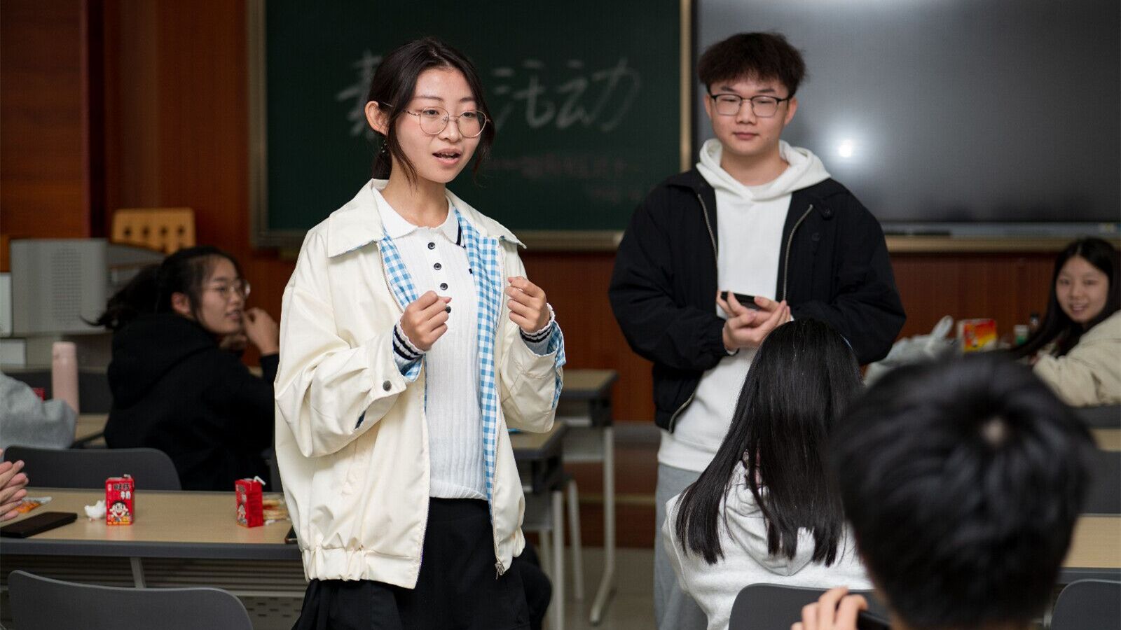 活动的第五个环节“故事接龙”环节则尽显成员创意。各自部门成一组,为大家展现共创的无厘头故事。有寻到怪物妹妹一起返回怪物的居住地,有每天家里刷新午饭原来发现是田螺姑娘的功劳。每有意料之外的内容接续和荒谬的故事情节,都让教室内的欢笑声愈发热烈。