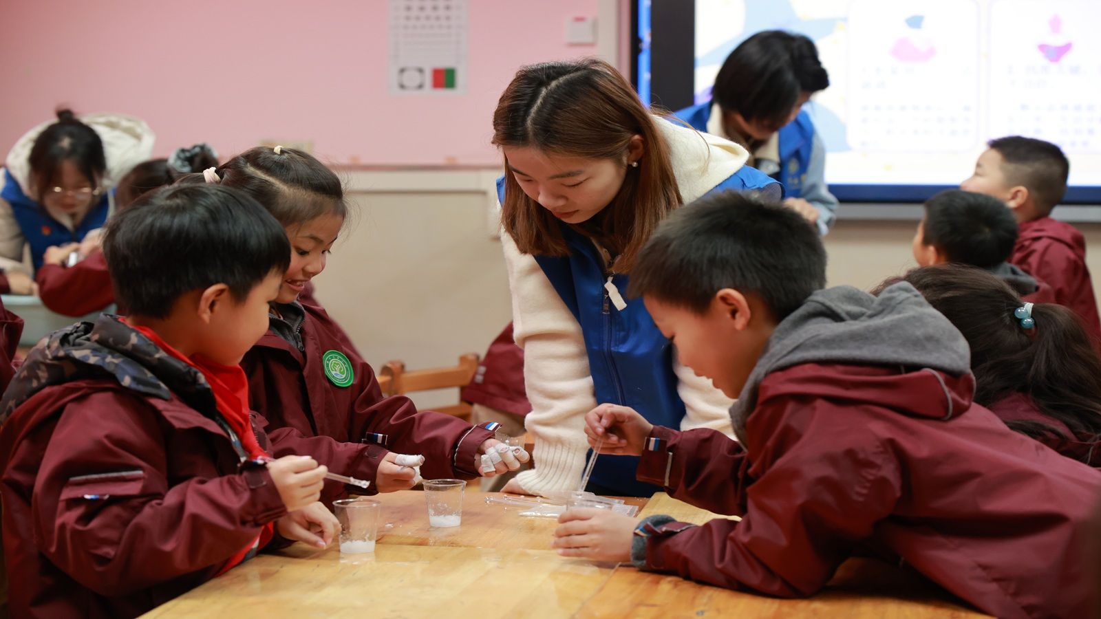 首先开始的“魔法金属变形记”科普实验中,研究生党员们以“材料星球的神奇礼物”为切入点,用生动浅显的语言和丰富的图片视频,为小朋友们讲解了记忆合金“记住”形状的特殊原理以及在航空航天、生物医疗等领域的奇妙应用。孩子们听得津津有味,大胆创想,踊跃提出自己的想法。在动手实验环节,志愿者们指导小朋友们亲手操作,观察记忆合金丝在热水中瞬间的形状变化,现场惊叹声与欢笑声此起彼伏,科学的种子在亲手实践中悄然萌芽。