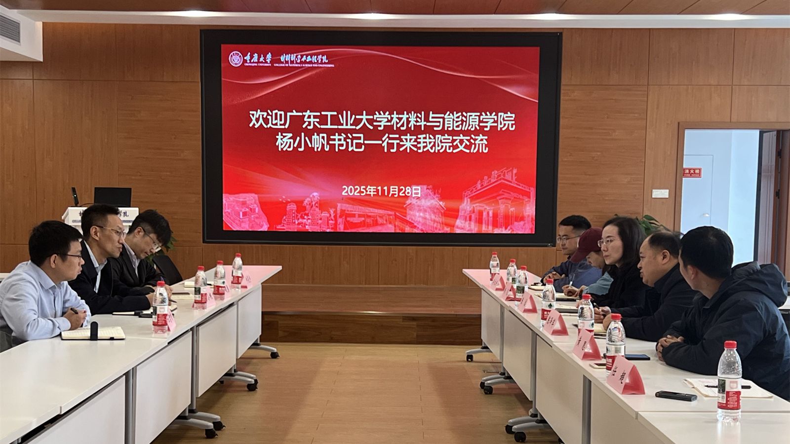 2025年11月28日,广东工业大学材料与能源学院党委书记杨小帆、院长助理陈健勇、王智彬副教授及辅导员申昊宇一行来我院调研。学院党委副书记、纪委书记陈洁,副院长陈泽军,党委组织员黄思,学办主任杨凡及辅导员任超、李大兴参与交流。会议由陈洁主持。
