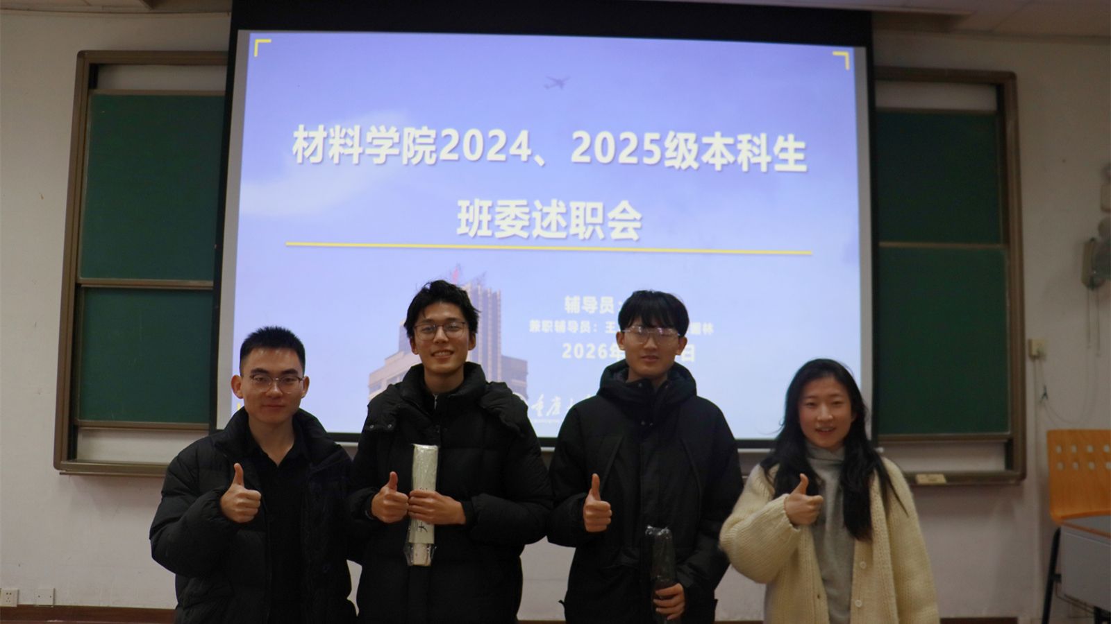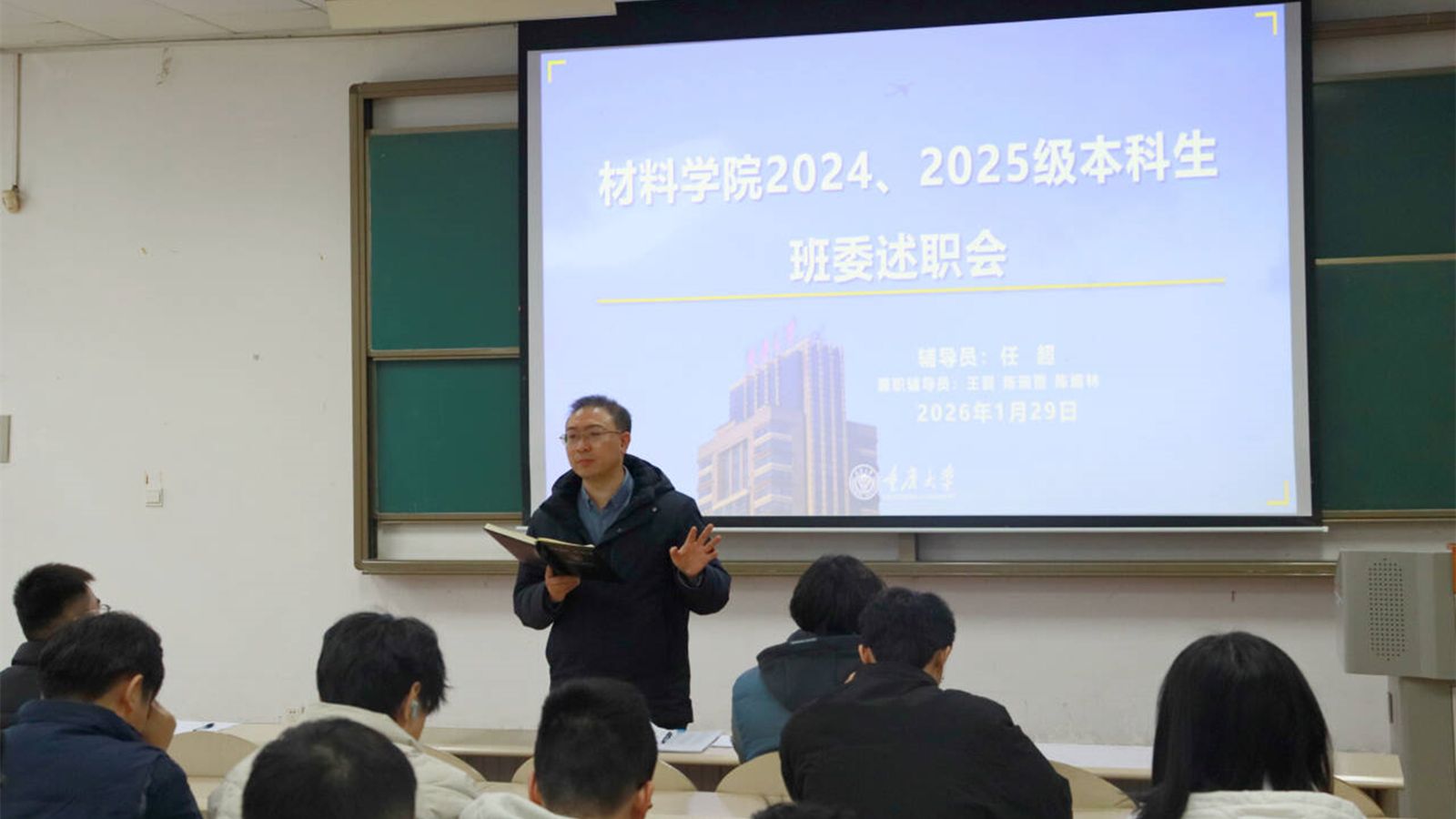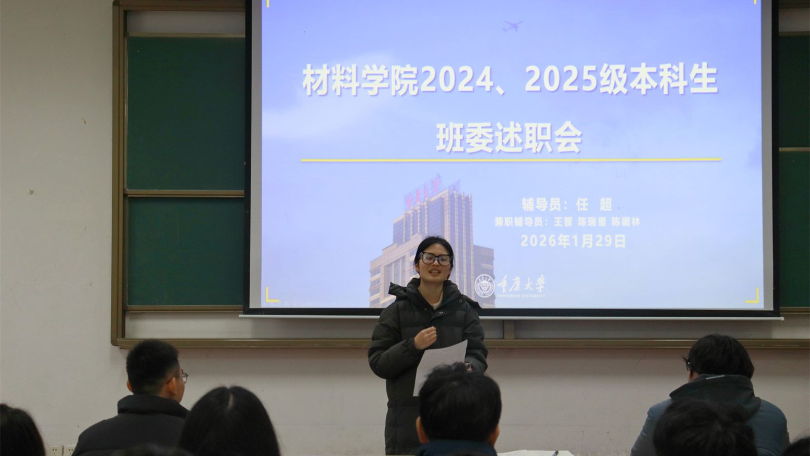 为系统总结2025年秋季学期班级工作成果,进一步加强班风学风建设,促进各班级之间的交流互鉴,2026年1月29日下午,材料学院在科学城校区虎溪校园综合楼DZ221组织召开2024级、2025级本科生班委述职评议会议。辅导员任超、兼职辅导员王晋、陈瑞雪、陈媚琳,学业助理代表易小棋及全体2024、2025级班委参加会议。会议由陈瑞雪主持。